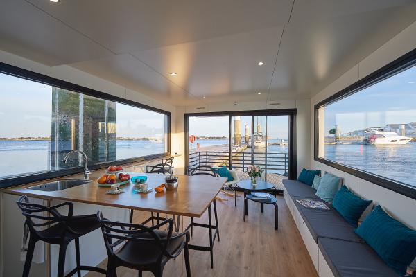 Ce loft flottant de 48m2 a été développé par le bureau d’étude JMKoncept en partenariat avec le chantier naval Sailwood basé à Lorient et la Sellor.